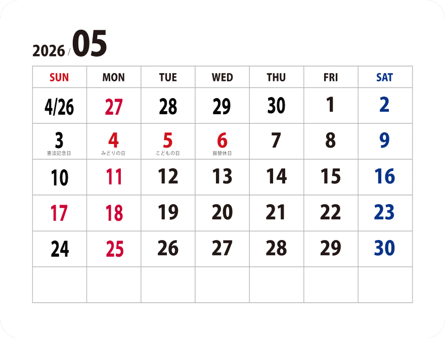 2026年ゴールデンウィークの営業案内。ご確認くださいませ。